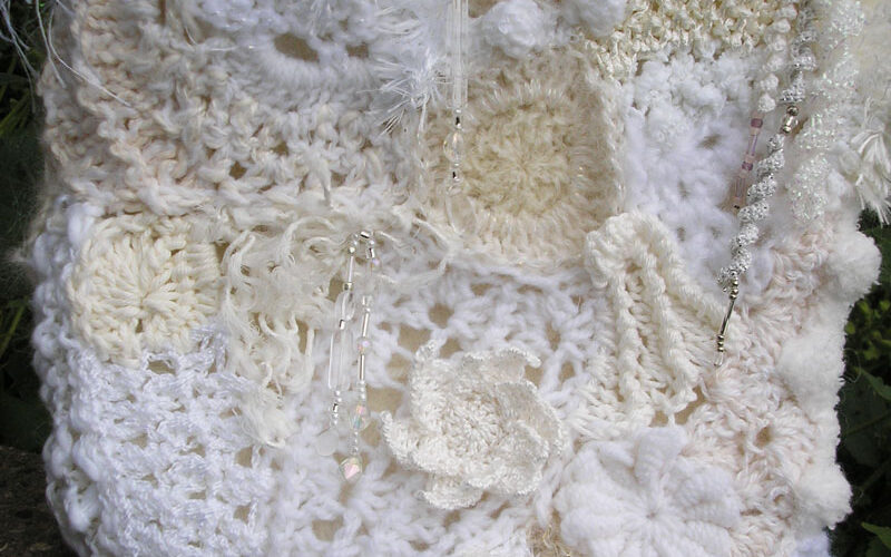 The base is a wet felted bag made with merino fibre and covered with scrumbles, beaded dangles and curlicues.