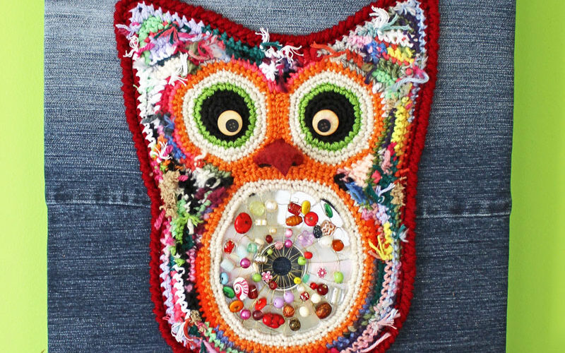 Yarn scraps, old denim jeans, broken jewellery, a CD which has seen better days, and a few stripped electrical cables. Harmoniously blended to bring the Night Owl to life.