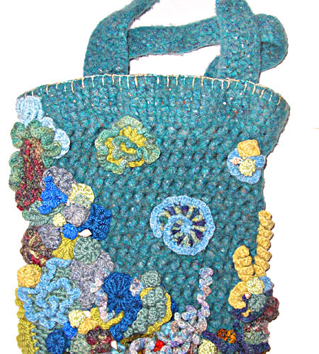 ” Emerging” – A felted crochet bag with freeform embellishments – inspiration for this Spring piece is our local pond life and the piece is representatitve of the pond life seen emerging during this season.