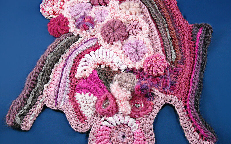 “How great it would be if it was possible to inhale all the bad things that happen in our world and exhale positive thoughts, ideas, understanding and caring for one another, tolerance and good wishes. Thus, I found myself creating a wall hanging of an entity who would inhale all things negative and burst forth with bright pinks and rose colors showing the world how good and wonderful we can all be. Which quite frankly is how I see the International Freeform group.”